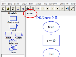 그러면 이제 본격적으로 프로그램을 만들어보겠습니다. 먼저 랩터로 위에서 보았던 순서도와 같이 다음과 같은 프로그램을 만듭니다. 우리는 앞에서 이와 똑 같은 내용을 만드는 과정을 실습해 보았으므로 여기서는 생략하기로 합니다. 다만, 다음과 같이 호출(Call) 기호를 끌어 넣어 추가하고, 추가된 기호를 더블 클릭하여 호출할 서브루틴 이름을 설정하면 다음과 같이 해당 이름의 순서도 탭도 새로 추가되는 것에 유의하세요.