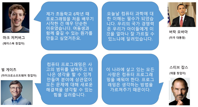 1994년에 이스라엘은 소프트웨어 과목을 정규과목에 포함했으며, 2009년 일본도 소프트웨어 교육을 필수 과목으로 지정했습니다. 얼마 전 영국에서는 청소년 교육 과정의 12개 정규 과목 중 영어 수학 과학 스포츠와 더불어 컴퓨터과학이 5개 필수 과목 중 하나로 지정되었습니다.