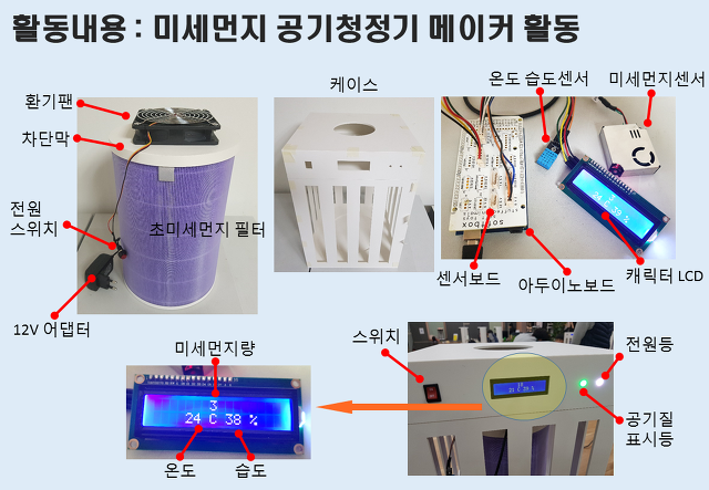 ● 목적: 미세먼지와 대기오염은 우리의 건강을 위협하고 있다. 미세먼지는 공기중의 아주 작은 입자로 우리 인체 깊은 곳까지 침투해 몸 전체에 영향을 준다. 학생들에게 환경의 중요성에 대해 인식하는 계기가 되고 미세먼지에 대해 배우면서 공기청정기를 직접 제작하는 메이커 프로젝트를 진행한다.