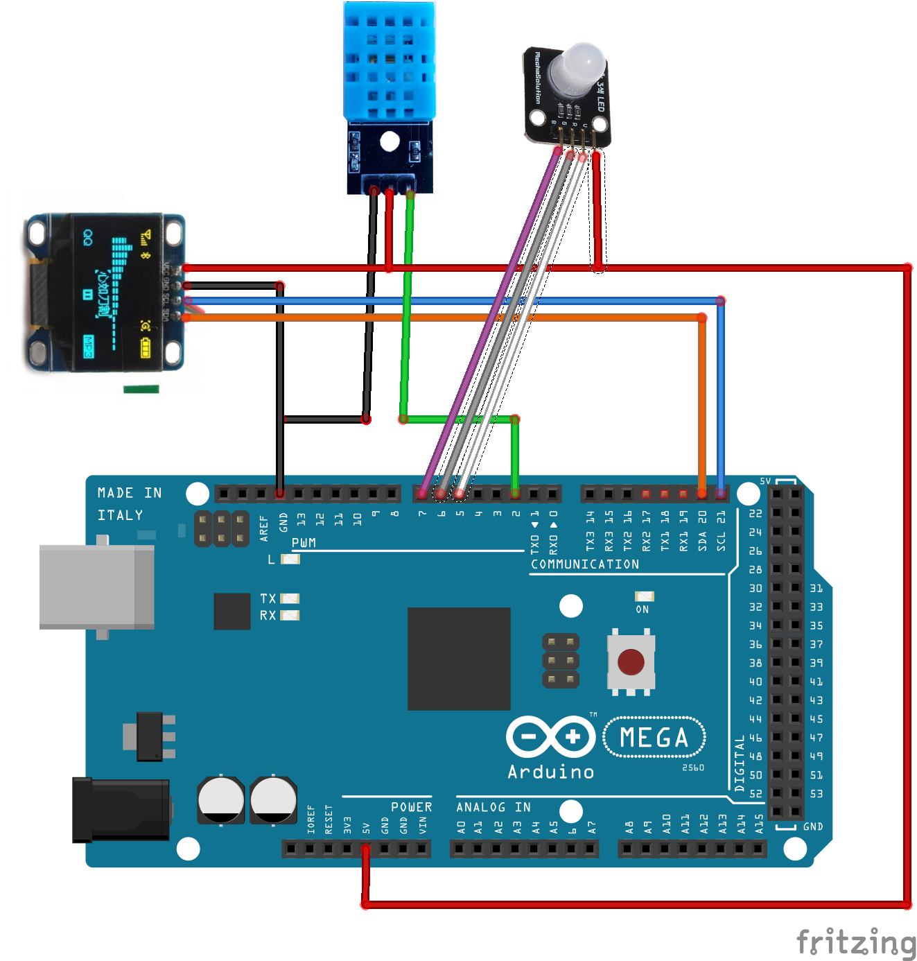 필요 부품: OLED, 온도 습도 센서, PM2008M 미세먼지 센서, RGB Led, 아두이노 메가