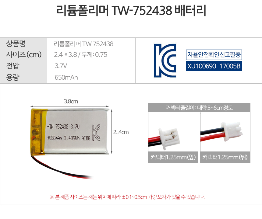 여기에 맞는 리튬 폴리머 배터리는 많이 나와있다. 실험용으로 구입한 리튬폴리머 배터리 제품은 링크를 참고한다. 배터리 용량이 커질 수록 가격도 비싸다.