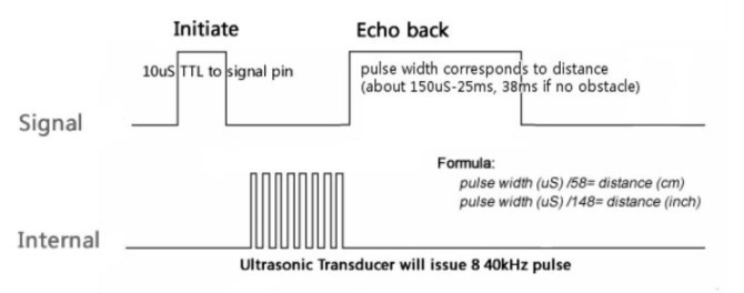 초음파 거리센서는 초음파를 대상에게 발사하여 반사되어 오는 반사파를 받을 때까지의 시간을 확인하여 거리를 측정하는 센서다. 초음파 센서는 40KHz의 펄스 신호를 출력하여 반사되어 돌아오는 펄스의 시간을 측정하여 거리를 계산한다. 여기서는 HC-SR04 초음파 센서를 사용한다.